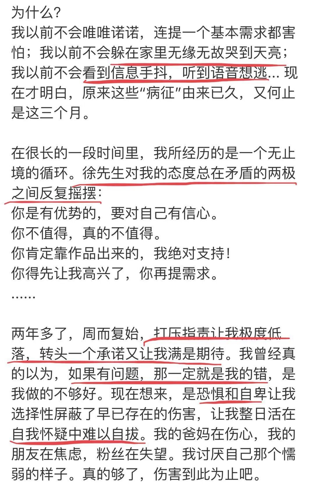 图源 微博@火箭少女101_Yamy 7月21日上午,前火箭少女成员Yamy公开了自己经纪公司会议的录音,并描述了她在公司的遭遇,引起了广大网友的不满,话题迅速冲上了微博热搜第一。 在这段的录音中,老板徐XX当着众多员工的面说她“很丑,不时尚,没有价值,唱歌难听,原来只是一个伴舞而已”,还称Yamy可能想不到他会在公司开她的批判大会。 Yamy表示,老板过去两年经常打压指责她,自己提出解约时,老板竟然回的是“情况了解,不要作死”。 图源 微博@火箭少女101_Yamy Yamy在文章中描述自己每天在极度自卑与恐惧中度过,会无缘无故哭到天亮……她的遭遇引起了很多人的共鸣,同时也带火了一个话题:职场PUA 今天和大家聊聊这个话题,以及我们可以怎么应对职场PUA。 可能还是有朋友不了解什么是职场PUA,我先简单解释一下。 PUA,全称是Pick-up Artist,这是起源于美国的“搭讪艺术”,原本是用于男女两性交往的一套方法。后来这个东西被别有用心的人利用,变成了用洗脑、诱骗、威胁、心理暗示等一系列精神控制手段,来欺骗异性的感情和钱财,甚至掌控对方的人生。 前段时间轰动的北大女学生包丽自杀事件,就是因为PUA而起。包丽被其男友长期精神折磨,最终导致崩溃自杀。 类似的事件网上还有很多,大家可以百度自查。 而职场PUA,是从爱情PUA上延伸出来的说法。它多发生在上司和下属之间,同样是通过一系列精神控制方法,来让下属丧失自我,最终对上司唯命是从。 曾看到一份职场白领心理调查显示,中国有64%的职场人都遭遇过职场PUA,前几天公众号“人物”也刊发过一篇文章,讲述各种职场PUA的套路。 上次的话题征集发出之后,后台收到各种各样五花八门的PUA故事,有几个让我看了简直胆战心惊。 可以说,职场PUA已经是一个非常普遍的现象。 那么职场PUA的套路有哪些?我们又该如何应对?接下来我会结合实际案例,给大家提供一些方法和思路,希望对各位有所帮助。 今天的文章较长,可是如果大家耐心看完,一定能有帮助。 首先我们来看职场PUA的通用套路,简单总结有下面4点,我一个个来说: “你太差了,什么都做不好。” 通过否定来实施精神打压 这是最普遍的职场PUA套路。在我收到的案例里,70%以上都是如此。 这个套路的核心关键在于,不断对下属的工作能力进行否定,以此摧毁对方的信心,让其丧失独立思考能力,从而任领导摆布。 比如有一位读者A说,领导平时和自己沟通工作时,总是对他进行酸溜溜的讽刺。A在请示工作的时候领导也是极尽挖苦之能事,每周开例会的最后一项日程永远是骂他: “你是个垃圾,愚蠢的猪,你一无是处,你是个笑话,你什么都做不好,你活着就是浪费。” 渐渐的,A在这样的语言暴力下变得浑身紧绷,每天看到领导都战战兢兢。领导让他做什么就做什么,没有丝毫怨言。即使后来A把工作做好了,也得不到领导的肯定,而是继续打压,让他觉得“这是应该的”。 这是一个很典型的案例。 许多人在工作上或多或少都经历过上司的批评和教育,但和职场PUA不同的地方在于,正常的批评教育都非常具体。 什么地方没做好,什么原因导致没做好,接下来可以怎么改正,这些问题都是有答案的。并且这些答案都能在批评教育的过程中,让下属逐渐领悟到,从而采取行动。 而职场PUA非常模糊。 它的精神打压,都是以情绪做主导,并没有具体行动上的理性指引。我们看下面几句话: “你有什么用,这都做不好。” “你做的事情一点价值都没有,我当初是怎么会把你招进来的。” “客户跟我投诉你,说你太笨了,要我把你换掉。” 以上这些话在我收到的案例中频频出现。它们都在宣泄情绪,而非解决问题。如果我们去反问具体细节,要么是被捣糨糊糊弄过去,要么会遭到更为严厉的语言打击,告诉你这都想不清楚是你自己的问题。 这导致的后果,是听者的人生信念被一点点摧毁,变成不能思考和判断的“工具人”。 有许多人在校期间或之前的公司里,都是表现很不错的人。可到了新公司经历无情的否定和打压,最后精神状态和个人能力都直线下滑,有的甚至发展成抑郁症。 长期处于这种精神压迫下,没有人能正常工作,只能对上司唯唯诺诺,从而被操控。越是如此越不可能做出成绩,越做不出成绩越是被继续打压,最后变成恶性循环。 “你还年轻,不要想那么多。” 灌输虚无缥缈的希望 这是第二个职场PUA的常见套路:通过不断的“‘望梅止渴”来给下属灌输希望,最后达到操纵的目的。 比如读者B向我讲述了自己的经历: B在大四期间,去了一家知名金融公司实习。实习期间他一直努力工作,加班什么的都是任劳任怨。 经过几个月的努力,B终于得到毕业转正的承诺。可到了转正时间,领导却告诉他公司政策有变动,得晚两个月给他办转正手续。 于是B又辛苦工作了2个月,等到第二次提出转正申请的时候,领导又故伎重演,告诉他要等到明年才可以转正。 这时B留了个心眼,开始到外面投简历。 没想到这事被他领导知道了,开始给B各种画大饼。什么公司很看好你的发展不要跳槽,转正了给你加薪,公司有很多大项目会让你参与等等。漂亮话说了很多,但就是不见行动。 就这么拖了6个月。 B拿着实习几百块的工资给领导做了半年的廉价劳动力。等他终于醒悟过来时,领导又告诉他要认清形势,现在年轻不要想那么多,你有缺陷,能找到一个地方上班已经很不错了。 甚至这个领导最